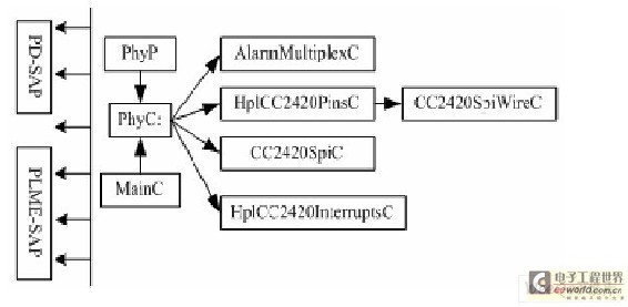 由图4 可知,原来方案中的系统集成级构件层的构件没有被调用,而直接调用硬件抽象层构件。由图4 与图2 对比发现,将原来系统集成层构件*能移到PhyP 构件中完成,这样避免了对底层构件的重复使用,整个结构更清晰简单。因此,需要对PhyP 构件做改进,使得其能够完成初始化射频芯片,调用射频芯片发送和接受数据。虽然看起来PhyP 构件要比实际代码量大,但是对改进后系统运行的测试结果表明,提高了10%的工作效率,缩减3000 行的代码量。