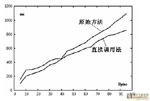 层数据接口时开始计时,到应用层收到包成功发送的确认消息为止。记录下这个响应时间,并依次增大发送数据包的的有效载荷,从10个字节增加到90,记录下有效载和增加时的响应时间。效率测试将分别在原始方案和直接调用法开发出来的协议中进行,统计两种不同方法的工作参数,最后得到的时间分布如图5