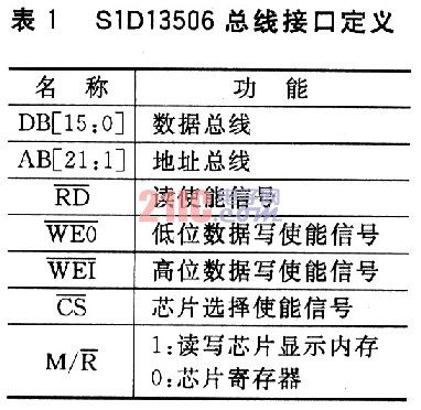 S1D13506与处理器的接口采用通用类型总线(包括数据总线、地址总线、控制总线)。接口定义如表1所列。芯片所用像素时钟CLKl、CLK2是由同步信号发生器ICSl523来提供的,外接1M×16位的EDO-DRAM IS41LVl6100。