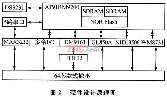 硬件设计原理图如图2所示。MultiBus—CPU模块选用Atmel公司的AT91RM9200为主处理器,融合了ARM920T ARM Thumb处理器。其工作于180 MHz时性能高达200 MIPS;具备存储器管理单元,可以运行Linux等实时操作系统;具备10/100 Base—T型以太网卡接口,只需外扩一个PHY即可实现以太网通信;具备USB 2.O全速(12 Mb/s)主机双端口,可以扩展键盘、鼠标、U盘等标准外设。