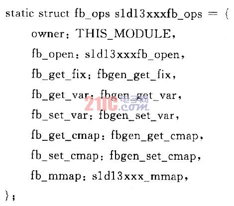 帧缓冲设备也属于字符设备,要通过“文件层-驱动层”的接口方式来对LCD进行驱动,就必须对File operationes数据结构的参数fb_ops进行填充,并实现其对应的成员函数。本系统在include/Linux/fb.h中定义了帧缓冲区的文件操作,部分代码如下: