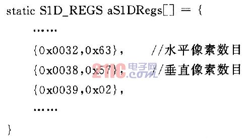 数组里每个元素的第1个值代表寄存器的名称,第2个值代表要设定的数值(1个十六进制的数)。32h寄存器用于设定LCD显示的水平像素数目,计算方法是把第2个值转换成十进制,加1再乘以8就得出水平像素。例如,0x63换算成十进制为99,加1乘以8就是800。38h和39h寄存器分别设置成0x57和0x02,就可以显示600的垂直分辨率。计算方法是以39h寄存器的bitO和bitl位为高位,38h寄存器的bitO~bit7为低位,组成的一个十六进制的数,再转换成十进制。除了要修改这3个寄存器外,34h和3Ah这两个寄存器也会对显示的分辨率有影响。