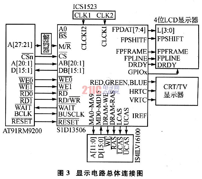 图3是显示电路总体连接图。S1D13506连接到AT9IRM9200的信号有: