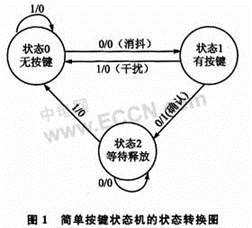 在图中,将1次按键完整的操作分解为3个状态。其中,状态0为按键的初始状态,当按键输入为“1”时,表示按键处于开放,输出“0”(I/0),下一状态仍为状态0;当按键输入为“0”时,表示按键闭合,但输出还是“0”(没有经过消抖,不能确认按键真正按下),下一状态进入状态1。