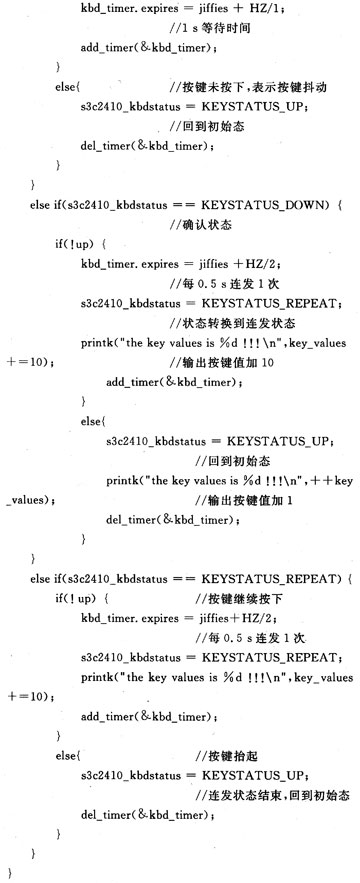 这里的定时函数使用了Linux的内核定时器。使用内核定时器可以方便地实现每个状态的特定定时时间,并且安全释放CPU,提高CPU的效率。程序的基本思路是,首先按键被按下进入按键中断服务程序buttons_interrupt(),在中断服务程序里确定按键状态是否为初始态。如果是,则进行kbd_timer初始化且使按键状态转为消抖状态。当kbd_timer定时到以后,按键检测按键状态是否仍处于按下时转换状态为按键确定状态,如果不是则恢复初始态。当定时器1 s到达后,判断按键是否仍是按下。如是则转换为连发状态,否则恢复初始态。当0.5 s到达后,重新判断按键是否仍是按下。如是,则继续为连发状态,输出值加10;如果按键抬起,则恢复初始态。