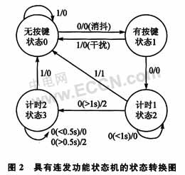 上面介绍的是最简单的情况,不管按键被按下的时间保持多长,在这个按键的整个过程中都只给出了一次确认的输出。但是有些场合为了方便使用者,根据使用者按按键的时间多少来确定是否按键“连发”。例如,在设置时钟时,按按键的时间较短时,设置加1;按按键时间较长时,设置加10,这时就需要根据按按键的时间长短来确定具体输出。图2是将按键驱动设计为具有连发功能状态机的状态转换图。
