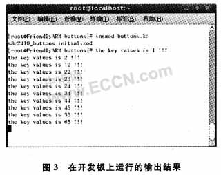 该驱动程序经过gcc-arm-liunx-3.4.4编译,并在Micro2440SDK开发板上运行(开发板上的系统版本为linux2.6.13),运行结果如图3所示。