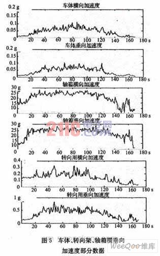 在我国某高速列车实验的振动参数测试中,对列车测振仪进行了试用,通过了最高280 km/h动车组实际运行检验。图5为实验中测得的部分数据,我们可以看出,运行中车体的横垂向振动加速度均在0.1 g左右,而轴箱处则高达数10 g。