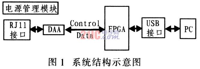 系统工作过程:当有来电时,DAA向FPGA申请中断。FPGA收到中断后,使用USB的中断传输向主机报告有外接来电,则PC的应用软件会提示用户选择摘机或拒绝。摘机后,FPGA在接收到命令后就会接通电话,然后语音数据通过USB的同步传输进行双向传送。当用户向外拨号时,其过程与来电时的情况是相同的。