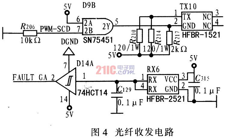 控制平台通过SPWM、SVPWM等调制产生PWM控制信号实现变流器的控制,再经驱动电路控制IGBT、IPM模块的主回路开关器,逆变产生交流输出。在通用控制平台上,将TMS320F2812中事件管理器EVA、EVB的16路PWM信号引入CPLD EPMl270T144,经CPLD处理和SN75451驱动后采用光纤HFBRl521输出。通用控制平台的PWM与主回路的驱动模块之间均经光纤隔离,可有效消除主回路对控制平台的干扰。驱动板同时通过16路光纤接收器HFBR252l接收驱动板发送的16路故障信号送至CPLD,用于封锁PWM输出。图4为单路光纤收发电路。