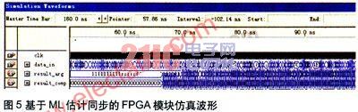 上述FPGA实现的是基于数据符号的OFDM系统同步算法,采用Altera公司的芯片EPlS25102015进行试验仿真,该芯片有25660个逻辑单元,1944576个存储模块单元,80个DSP模块单元,707个I/O输出引脚。