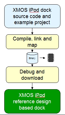 XS1-L事件驱动处理器可采用C,、XC 和 C++语言编程,它为用户提供一个完全灵活的嵌入式软件定义工作流程。除了其强大的音频处理能力以外,该参考设计还提供了多种数字音频接口可供选择,包括I2S、SPDIF、1位软件DAC以及脉宽调制(PWM)等,并且将支持客户化前面板( front-of-box)外围设备和控制代码的开发。该处理器的固件还可通过采用设备固件升级,在未来任何时刻进行更新,为基于订阅的各种产品扩展服务、以及各种软件和硬件的升级创造了条件。下图给出了iPod底座开发流程。