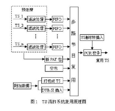 数字电视节目的复用包括两个阶段, 对音/视频 PES包的节目复用和对 TS流的系统复用[4]。本文研究第二个阶段即 TS系统级复用,将多个单路的 TS流合成一个多节目 TS流。数字电视系统级复用是数字电视系统的关键技术之一, 其中数字电视节目专用信息 PSI 的提取和重构及系统层节目时间参考 PCR 值的修正,是复用器的两项关键技术。