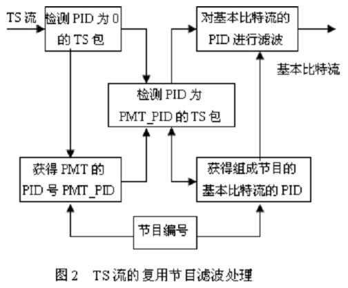 基于 MPEG-2 的 TS 流多路数字电视节目 TS 流系统级复用原理如图 1 所示。当多路 TS 流复用成一路 TS流时,首先将对各路 TS流的 PSI 进行搜集并分析其码流,得到各路 TS码流中相应的视频、音频、数据信息的码率、对各路节目的包标识 PID, 数字电视节目专用信息PSI,节目时间参考 PCR 等信息进行处理,丢弃各路原有的 PSI 信息。当出现两路 TS 流中的 PID发生冲突时, 需要修改一路或者多路 TS流中某一数据流的 PID(即复用器需要对修改了 PID的视频/音频包或其他数据包进行 PID更新)。可以看到,无论是否出现 PID冲突,复用器都需要重构 PSI 信息,其滤波的处理过程如图 2 所示。对不同节目的 PID 值进行修改后,与本地产生的这类数据重新整合为复用后新的 PSI 等系统级控制信息,同时插入符合 DVB-SI 规范的业务信息, 并在携带有调整字段的 TS包中, 判断带有 PCR标志位字段的值,如果该值为“1”,那么在该 TS 流离开复用器的时刻,需要对 TS 包中的 PCR 值做相应的修正或重新插入新的节目时钟参考,具体方法将在后面详细介绍。