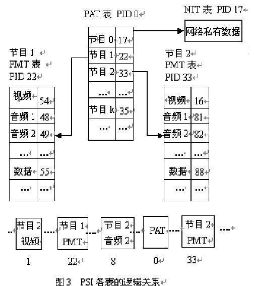 数字电视节目专用信息 PSI 描述 TS流的组成结构,在 MPEG-2 系统层中极为重要,一个有多路节目和私有数据的 TS 流,需要 PSI信息将每一路节目的音视频对应起来[5]。PSI 信息将 TS 流中的内容描述成一个树状的结构,如图 3 所示。在 TS流中可以复用多个节目,每个节目又可以包含多个基本码流(通常是单个视频流、多个音频流)。DVB 系统沿用 MPEG-2 的节目专用信息 PSI来确定传输的节目和包标识 PID 的关系以及节目的组成结构等情况。 PSI 主要包括以下四个表:节目关联表(PAT: Program AssociationTable)、条件访问表(CAT: Conditional Access Table)、节目映射表(PMT: Program Map Table)、网络信息表