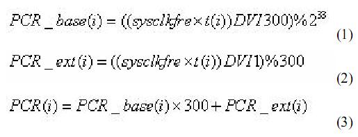 其中 sysclkfre 为系统时钟 27MHZ。PCR 的单位是 1 /27M 秒,分为两部分表示。实际编程中,当得到一个新的 PCR 值,用式(1)和式 (2) 得到 PCR_base ( 33bit) 和 PCR_ext ( 9bit)两 部分,填入 TS 帧中。在输出码率恒定的情况下,每一个 TS 帧传输所用的时间△PCR 值可以通过下式计算: