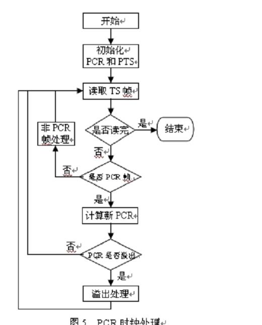 式中,PCR_old 代表上一个 PCR 的值,PCR_new 代表当前新 PCR 的值。在得到新的 PCR 值之后,用公式(1)(2)(3) 计算出PCR_base和 PCR_ext 写入帧中, 同时 PCR_old = PCR new, nCounter=0。 nCouter 是对整个传输流而言的,不管TS 帧是不是当前计算的这路 TS 的内容,或者空帧,nCounter都要累加。