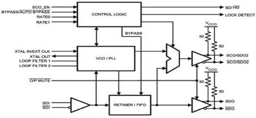 时钟恢复部分电路处理过程由图4所示。通过图4可以看到,正确地设置好芯片的工作模式,由本地提供一个27M的时钟供时钟恢复芯片使用,将均衡后的高速差分信号输入到芯片中,通过芯片处理后恢复出串行信号之中的时钟信号,以便下面解码部分电路使用。同时,该芯片也可支持高清信号的时钟恢复功能。