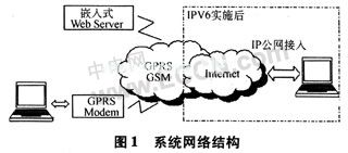 目前中国移动GPRS网络路由分配给移动台的是内部IP,所以只能实现路由内部局域网的访问,即由一台通过GPRS Modem上网的MCU来访问嵌入式Web Server,系统的网络结构图如图1。