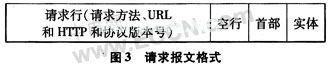 请求报文一般包括请求行、首部和实体(有时包含)3部分。其中,请求行包括请求方法、URL(统一资源定位地址)和HTTP协议版本号3部分,其报文格式如图3所示。在请求行中,请求方法是客户端向服务器端发出的命令,URL是所请求网页资源的地址,HTTP版本是指报文所使用的HTTP协议版本号。常用的请求方法有Get和Post两种:Get方法通常只是用于请求服务器上的URL所指定的资源;Post方法用于客户端向服务器端提供信息,所提供的信息位于请求报文的实体部分。
