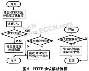 MCU接收HTTP方法并设定方法标志位,计算URL,然后判断HTTP方法。若HTTP方法为Get,则判断是否存在对应的网页,如果存在,则确定接收HTTP方法并设定方法标志,然后返回;如果不存在对应的网页,直接返回。若HTTP方法为Post,则接收并处理控制数据,然后返回。