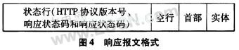 响应报文一般包括状态行、首部和实体(有时包含)3部分,其报文格式如图4所示。在响应报文中,状态行定义了响应报文的状态,并由响应状态码和响应状态码说明字段反应。其中,200系列的代码用于指示成功的请求。