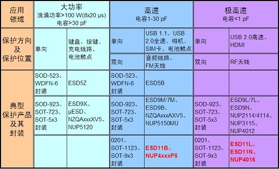 | 表1:便携设备ESD保护应用分类及典型保护产品(其中红色字体为领先产品)。 |