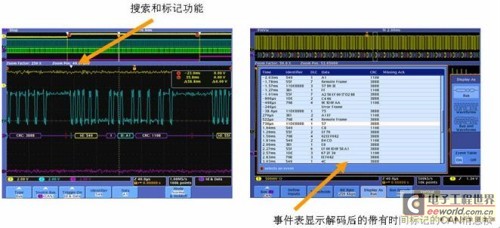 对于汽车中常用的CAN、LIN这类低速串行总线的调试,泰克的DPO/MSO4000系列示波器提供了简单、易用、完整、高品质的触发、捕获和解码解决方案。如图2,该示波器系列提供了搜索和标记功能,可在事件表显示解码后的带有时间标记的CAN消息帧,这一功能是其他竞争性产品所不具备的。
