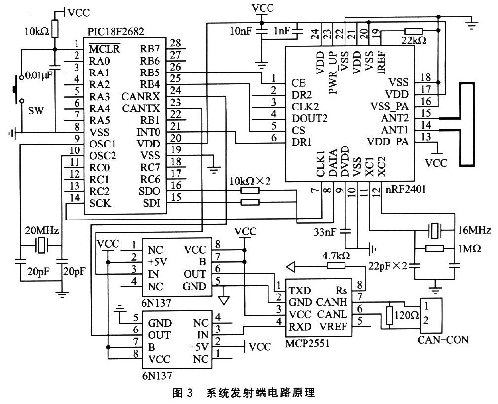 图3是系统发射端电路原理。CAN总线接口使用Microchip公司内置CAN模块的PIC18F2682单片机,并由光耦6N137进行总线隔离;CAN总线收发器采用MCP2551。