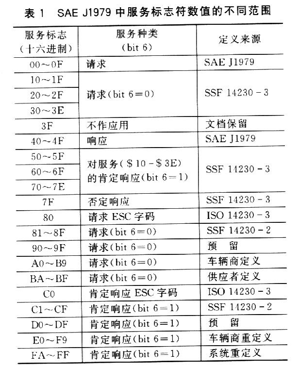 此表中以十六进制数表示的服务标志符,同数据链路层中数据字节内的SID服务识别字节对应。不同的SID值代表不同的服务请求,故障诊断程序必须符合此应用层标准,才能识别不同的十六进制代码所代表的不同的故障信息。