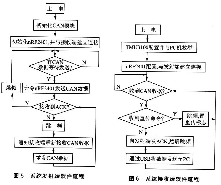 接收端软件流程如图6所示。软件设计主要实现两项功能:第一是实现枚举;第二是实现将接收到的数据通过USB上传到PC。上电后,首先完成对TMU3100的配置,并与PC机枚举;枚举成功后就对nRF2401进行配置,并与发射端建立连接。当接收到数据包后,首先判断是CAN数据还是重传数据命令。如果是CAN数据包,则向发射端返回ACK信号并跳频,然后将接收到的数据通过USB传至PC;如果是重传命令,则先跳频,然后置重传标志,表示下个数据包是重传的数据包。