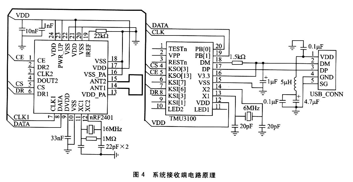 图4是系统接收端电路原理。由于TMU3100由PC供电,而PC机USB接口所提供的电压VDD干扰较大,故对VDD进行了π滤波。
