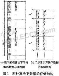 逐字符索引算法下,将空格按字符看待并进行编码,菜单每行固定显示n个字符,字符长度小于n的菜单行由空格来补齐。由于采用定长的存储结构,所以字符索引电路原理简单且易于实现,只需要根据菜单字行符长数n就可以计算出相应行字符的首地址指针。但这种存储结构的缺点也很明显,就是对存储器的使用量较大。在该算法下,可以计算出在OSD所需要的使用的存储器量为:m×n×Ch,如图1(a)所示。存人其中的“空格”(图中编码为“28”)会占用相当一部分的存储器资源。在一些情况中,用于补充空缺而存储的“空格”所占用的存储空间甚至会比字符点阵信息的存储空间还要多,这是对存储器资源极大的浪费。