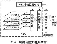 从输出缓存中读出的数据用于控制生成菜单字符层,在层选择电路中与菜单背景层和属性条层进行叠加处理后输出一幅完整的菜单。字符层、菜单背景层和属性条层相互独立,由层混合控制电路控制进行混合叠加处理,再将菜单与屏幕背景层进行叠加输出混合视频信号。层混合叠加电路的实现结构如图4所示。