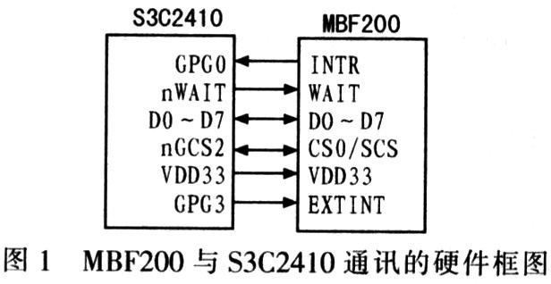 S3C2410与MBF200通讯支持MCU通讯方式、USB通讯方式和SPI通讯3种数据传输方式。此系统采用MCU和USB通讯方式。由于MCU通讯方式具有操作简单、数据传输速度快等优点,这里讨论基于MCU通讯的指纹采集系统。MBF200与S3C2410通讯的硬件框图与指纹采集系统原理图分别如图1、图2所示。