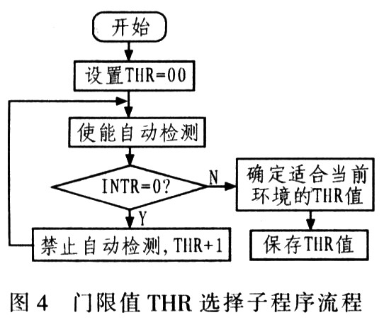(1)门限值THR的选择门限值THR和周围环境的温度、湿度等有关,周围环境不同,门限值也不同。当门限值不合适时,器件在空闲状态会被认为是有手指按下,中断信号为低电平。因此,在采集时必须选择门限值。门限值选择流程如图4所示。