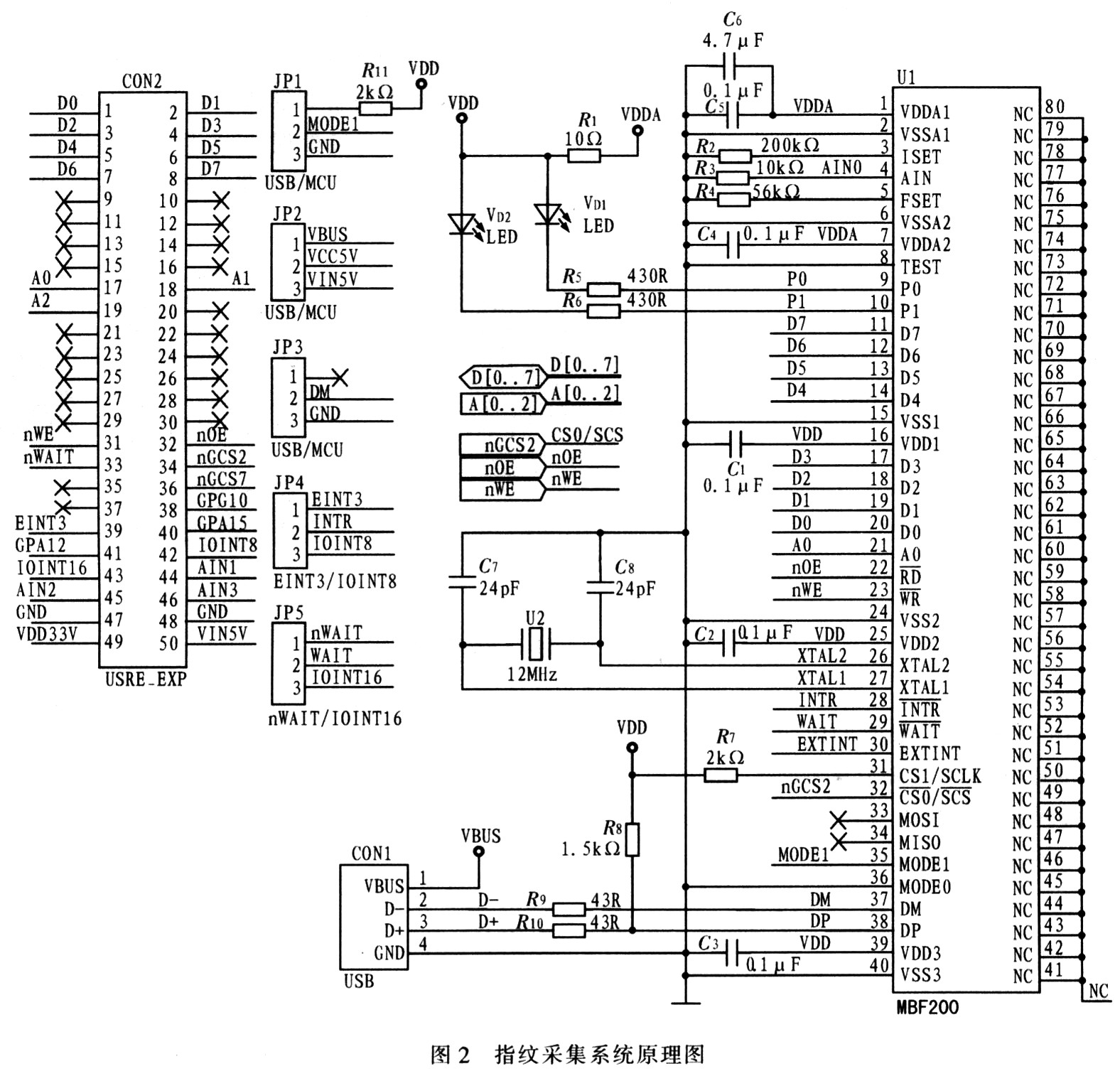 D[7:0]实现与S3C2410的通讯,索引寄存器对应存储空间的最低位为0,功能寄存器对应最低位为1;当跳针JP1,JP2,JP3跳到右边时为MCU通讯方式;nGCS2与选通信号CSO连接,用于选通MBF200;S3C2410引脚nOE与MBF200的RD引脚连接,产生读信号;S3C2410引脚nWE与MBF200的WR引脚连接,产生写信号;电路中接2个LED,与MBF200引脚P1、P0相连,低电平亮,用于测试硬件电路;JP4连接EINT与MBF200的INTR中断引脚;WAIT引脚用于在指纹采集时查看A/D转换是否完成,防止在A/D转换未完成时读出随机数据,导致数据采集失败;MBF200供电电源选择S3C2410引脚49提供的VDD33 V。