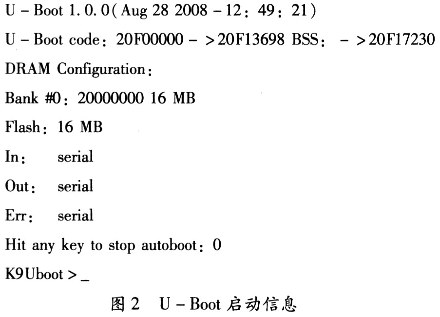 最后在Linux里安装交叉编译器,笔者用的交叉编译器的版本是2.95.3,编译代码,生成U-Boot.bin文件。U-Boot启动后显示,如图2所示。