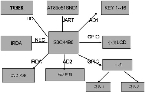 系统的硬件电路部分主要由按键、红外遥控、MOTOR控制、收音机、MP3、DVD以及LCD显示模块等构成,模块部分都由MCU通过相应的通讯协议进行控制。鉴于MCU在处理速度、外设功能以及价格等方面的考虑,32位ARM处理器在片内资源、性价比方面都明显优于8位MCU。这里选用ARM7TDMI处理器S3C44B0" title="S3C44B0">S3C44B0作为主控芯片。该芯片与外设的连接如图1所示。