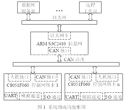 本系统由信息网络层和控制网络层两部分组成。信息网络层是基于S3C2410的ARM系统,运行着TCP/IP协议和现场总线CAN协议;控制网络层是基于C8051F060的控制网络测控系统,它直接与工业测控设备联系,负责测量、调节现场参数,将测量结果通过CAN送给ARM,或是接收ARM下传的数据调控现场设备。论文对CAN总线控制网络和因特网进行了深入研究,提出在提高信息网络协议标准的实时性和兼容性的基础上,从底层设备到远程监控系统都使用统一的协议标准的设计方案,以确保信息准确、快速、完整传输。本方案的优点是价格低廉、功能强大、方便灵活。整个系统的示意图如1所示。