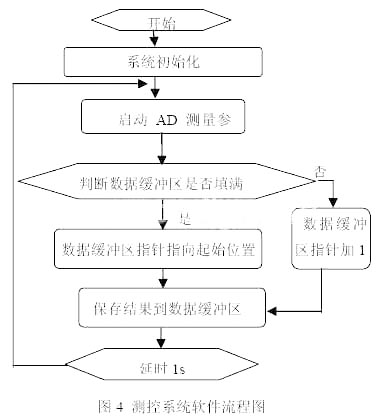 由于被测控的几个量都是缓慢变化的,对测控系统的实时性要求不高。单片机大部分时间在进行参数测量,每次测量结束后使用查询方式将测量结果保存到数据缓冲区中。由于单片机的RAM容量有限(C8051F060具有4K的RAM),使用了数据缓冲区,以保存一定数量的测量结果。缓冲区使用先进先出策略,在保存时先判断缓冲区是否填满,没满时缓冲指针加1,数据保存进下一个单元,填满时使指针指向缓冲区的顶部,数据保存进缓冲区,以前的数据丢掉。本系统的设计重点是CAN通信,因此,在CAN通信时采用了中断方式。整个测控系统部分的软件流程图如图4。