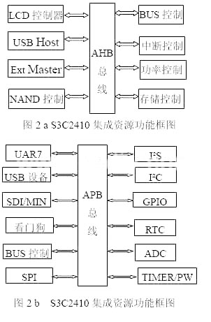 信息网络层采用的S3C2410,是韩国三星电子公司最近推出的一款基于ARM920T内核的16/32位RISC嵌入式微处理器。该处理器主要面向手持式设备以及高性价比、低功耗的应用。S3C2410内部结构较复杂,提供可扩展的功能模块也较多,如图2所示。