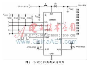 LM3530具有1 A限电流的特征以及从2.7 V~5.5 V的输入电压范围,使设备可作为一种多用途的背光电源,非常适合用于单一锂电池的电压范围。通过I2C可兼容接口在5 mA~30 mA范围内调节最大LED电流。与传统的WLED驱动器拓扑结构不同,LM3530拥有真正的关机功能以提高效率。此外,它还具有高达43 V的过电压保护功能。LM3530最强大的功能在于其具有支持环境光感应(ALS)和动态背光控制(DBC)的能力。