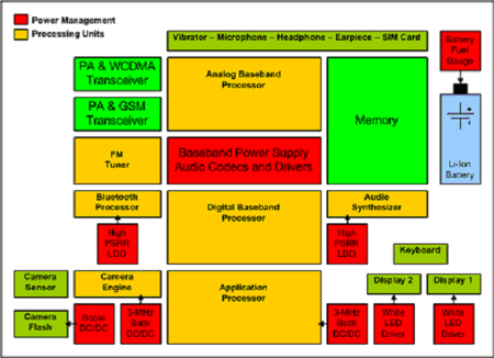 图字(上下、左右):电源管理、处理单元、PA与WCDMA收发器、PA与GSM收发器、调频接收器、蓝牙处理器、高PSRR LDO、相机传感器、相机闪光灯、相机引擎、升压DC/DC、3MHz降压DC/DC、振动器-麦克风-耳机-耳承-SIM卡、模拟基带处理器、基带电源 /音频编解码器与驱动器、数字基带处理器、应用处理器、存储器、音频综合器、高PSRR LDO、键盘、显示屏1、显示屏1、3MHz降压DC/DC、白LED驱动器、白LED驱动器、电池容量计、锂离子电池。