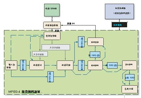 图 1 和 2 分别显示了 MPEG-4 简易编码器和解码器核的框图。这些设计采用了基于硬件的流水线架构,编码器上提供了一个主机接口,用于实现软件控制的速率控制。使用内含的存储器控制器,编码器的原始捕捉序列和解码器的重建帧被存储在片外存储器中,以便快速、低延迟地存取像素数据。它还提供了一个简单的 FIFO 接口,用于传输压缩位流,解码器可根据用户指定数量的位流定制构建。它还包含一个系统接口,以实现最大的可控制性和可观测性。