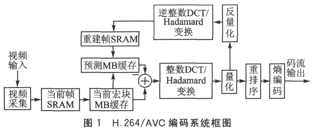 摄像头摄入的视频图像首先经过视频采集模块处理,并将当前帧的图像数据存入SRAM。然后,以宏块MB(macroblock)为单元,从SRAM中读取原始图像,并根据MB所在图像帧内的位置,读取重建帧中的参考像素进行帧内预测,并将预测宏块与当前宏块像素做差即可得到预测残差。接下来,对残差图像进行整数DCT变换或Had—amard变换,并对变换输出进行量化。量化输出的残差图像一方面通过反变换和反量化处理生成重建图像供帧内预测作为参考,另一方面经过重排序、熵编码处理得到最终的图像压缩码流输出。