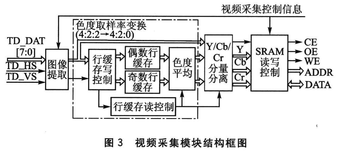 根据上面对视频采集部分硬件结构的分析,设计了图3所示的视频采集模块结构框图。可以看出,图像采集模块主要包含图像提取、色度取样率变换、Y/Cb/Cr图像分量分离以及图像缓存SRAM读写控制等单元。