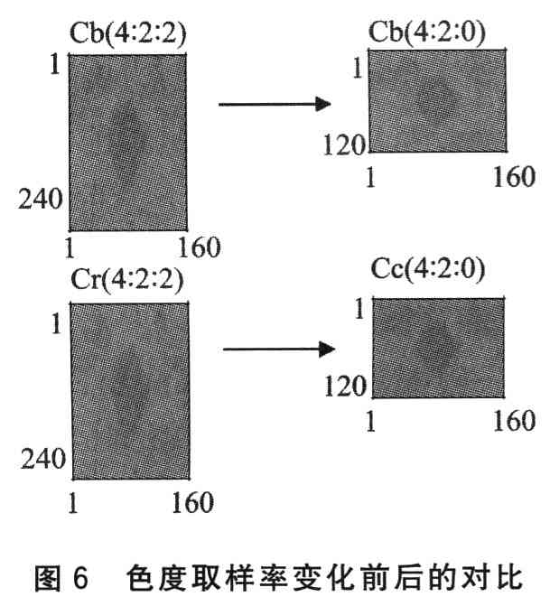经过取样率变换后的图像数据需要根据Y/Cb/Cr图像类型在SRAM中分片区缓存,以方便后续的H_264的编码处理。图6给出了实际图像的色度分量在取样率变换前后的效果。