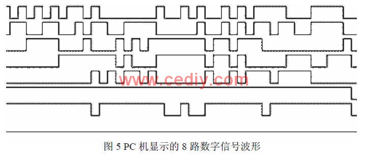 图 5是通过嵌入式逻辑分析仪采集后,通过串行通信口送到 PC机,在 PC机屏幕上显示的 8路数字信号实拍照片。