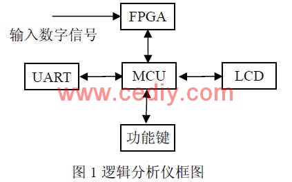 由于数字信号只有高电平和低电平两种情况,因此,用单片机 (MCU)就可直接实现多路数字信号进行采集和逻辑分析。但由于单片机的时钟频率较低,完成一次采样的时间受程序执行指令速度的限制,采样速率通常不超过 1MHz。因此,用单片机只能实现对低速率数字信号进行逻辑分析。FPGA的工作时钟速率通常可达 200MHz以上,可对高速数字信号进行采样,但普通的 FPGA在与外部设备进行数据交换时显得不灵活。为了解决上述问题,通常是将 MCU与 FPGA结合起来,用 FPGA对高速数字信号进行采样,用 MCU负责与外部设备进行数据交换,从而实现对高速数字信号进行逻辑分析,如图 1所示。